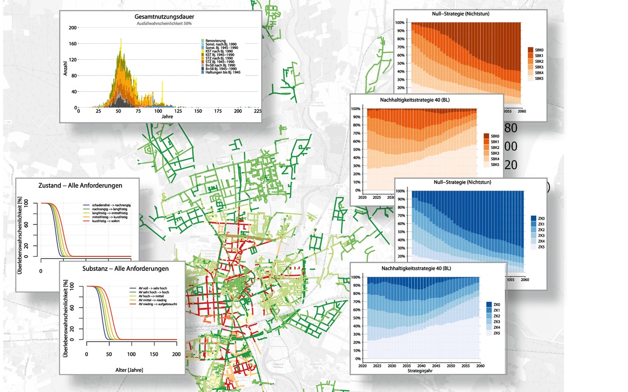 Das ausgeschriebene Projekt war in zwei Phasen aufgeteilt. In Phase I - dem Instandhaltungs- bzw. Schnellcheck wurde anhand der übergebenen Netzdaten die IST-Situation bewertet. Dabei wurde die vom schwersten Einzelschaden dominierte Sichtweise der Zustandsbewertung durch die Bewertung der baulichen Substanz erweitert und die Kenntnis der Sanierungsdringlichkeit der Kanäle um das Wissen des noch vorhandenen Abnutzungsvorrates und der voraussichtlichen Hauptsanierungsart – Reparatur, Renovierung oder Erneuerung ergänzt. Unter Nutzung vereinheitlichter Modelle sowie Betreiberangaben zu operativen als auch strategischen Kennzahlen und Zielen wurde anschließend in kürzester Zeit ein belastbarer Überblick über die zu erwartende Netzentwicklung erstellt.